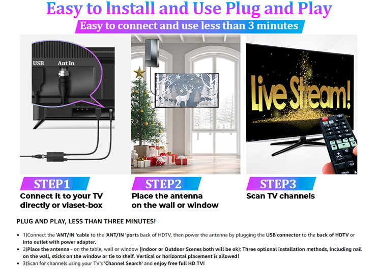 - ? 【VALUE PACKAGING】- TV antenna(10*20*2 inch), powerful antenna amplifier, coaxial cable, USB cable, 5V power adapter, the installation accessories of three installation methods include (① screw + screw sleeve, positioning jam, ② double sided adhesive tape , ③nylon cable ties ), instruction manual.
