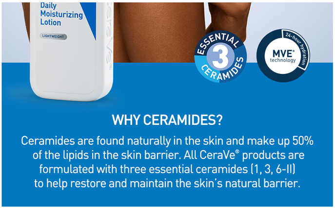 • [ 3 ESSENTIAL CERAMIDES ] Ceramides are found naturally in the skin and make up 50% of the lipids in the skin barrier. All CeraVe products are formulated with three essential ceramides (1, 3, 6-II) to help restore and maintain the skin’s natural barrier