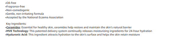 Developed with dermatologists, CeraVe Daily Moisturizing Lotion has a unique, lightweight and non-greasy formula that provides 24-hour hydration with slow release of MVE Technology and helps restore the protective skin barrier with three essential ceramides (1,3,6-II). The formula also contains hyaluronic acid to help retain skin’s natural moisture. This oil-free moisturizer with hyaluronic acid leaves the skin feeling comfortable and is gentle on skin.