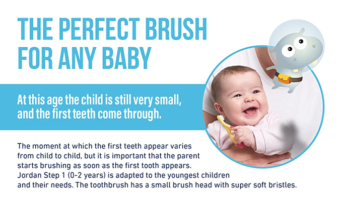 - MADE FOR YOUR BABY - Jordan* is the original brand of this infant toothbrush designed with extra soft bristles, a soft biting ring for babies gums, and a handle that suits adults and babies