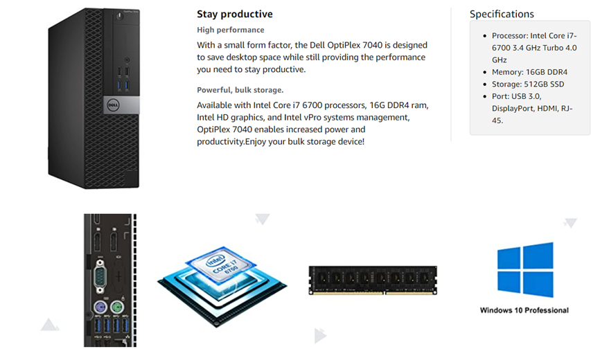 - Dell OptiPlex 7040 Small Form Factor PC, Intel Quad Core i7-6700 up to 4.0GHz, 16G DDR4, 512G SSD.