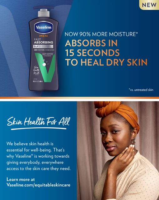 Vaseline Men's Healing Moisture Fast Absorbing Body Lotion has been specially formulated to hydrate and restore dry or cracked skin. This body lotion for men is formulated with Ultra-Hydrating Lipids that fortify the skin barrier and replenish moisture. With daily exposure to environmental triggers (like wind, lack of humidity, and sun), skin's natural moisture barrier can break down, allowing water to escape the skin. But the Ultra-Hydrating lipids in our lotion fortify the skin barrier and replenish moisture to allow the skin's natural barrier to recover. This lotion locks in moisture and promotes smooth, naturally glowing skin. The body moisturizer is clinically tested to provide 90% more moisture (vs. untreated skin). This lotion for dry skin absorbs fast and provides 48-hour moisture. Use this dermatologist-tested body lotion daily on dry, rough skin for stronger, noticeably healthier skin. Made of 50% recycled plastic, our ambition is to get to 100% recycled plastic in the near future. Since 2018, we've used 337 Metric Tons of recycled plastic across the Vaseline product portfolio in North America. Vaseline Men range works to heal dry skin from deep within. Vaseline has a range of products to help heal, soothe, and moisturize all skin.