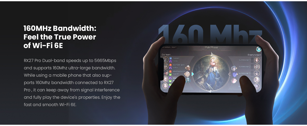 RX27 Pro is a Gigabit Wi-Fi 6E router designed for users who are looking for a performance experience. It supports Wi-Fi 6E, which can bring more bandwidth, faster speed, and near-zero latency. It has a concurrent rate of up to 5665 Mbps (6GHz: 2402 Mbps, 5GHz: 2402 Mbps, 2.4GHz: 861 Mbps). Besides, RX27 Pro is equipped with 7 high-power FEMS, the Wi-Fi signal penetrates the wall stronger and the transmission distance is longer. And It's equipped with Broadcom 1.7GHz quad-core CPU, delivering powerful computing power, and stable operation. With the OFDMA and MU-MIMO technology, more devices can access the Internet at the same time, the transmission efficiency is significantly improved, and the delay is greatly reduced.