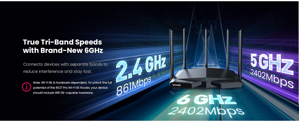 - Note: Wi-Fi 6E is hardware dependent. To unlock the full potential of the RX27 Pro Wi-Fi 6E Router, your device should include WiFi 6E-capable hardware.
