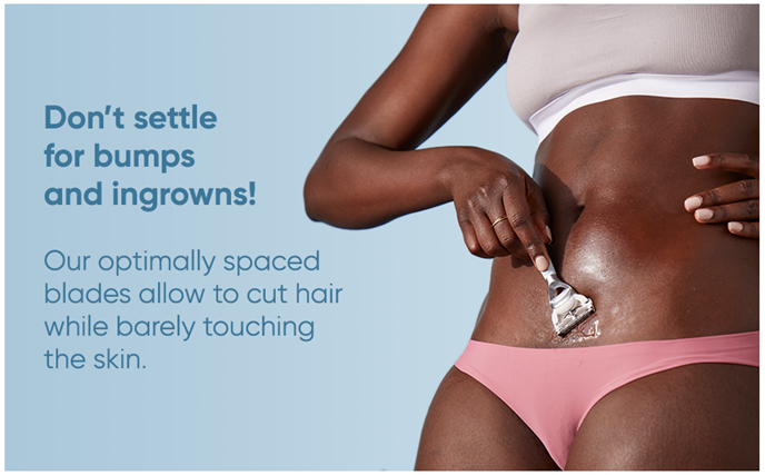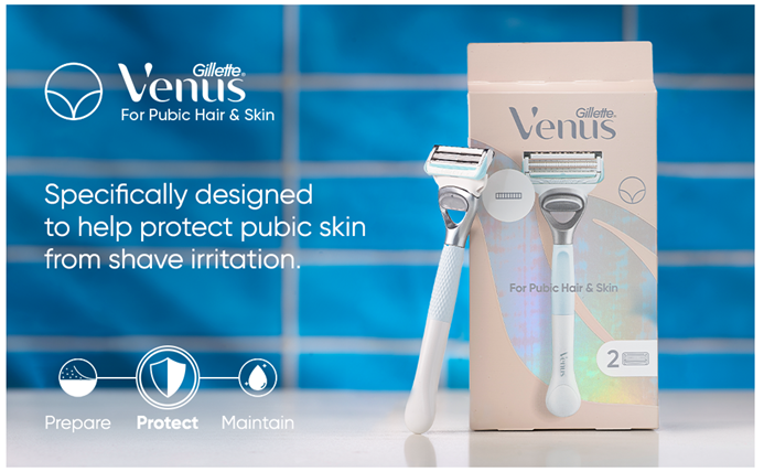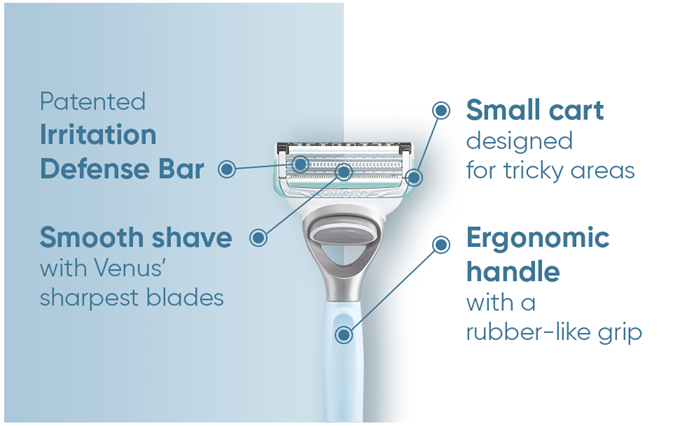 Venus's pubic hair and skin blades are specifically designed to help protect pubic skin from shave irritation. They have a patented irritation defense bar and optimally spaced blades that allow the blades to cut hair while barely touching the skin. Also, the razor refills come equipped with a precision Trimmer on the back of the blades to help with tricky areas.
