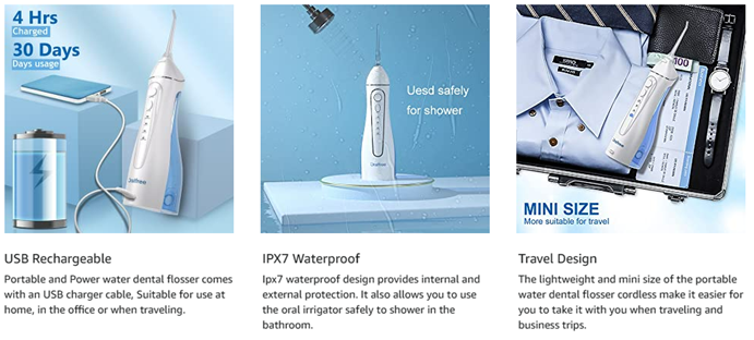 - POWERFUL BATTERY WITH USB CABLE AND IPX7 WATERPROOF: Water Dental Flosser Cordless for Teeth With powerful and environmental battery, fully charged need 4 hours and used continuously for about 30 days. Come with USB Cable, applicable to a variety of charging equipements such as power bank, computer, laptop... With double-sealing rings, oral irrigator braces flossers prevent water leakage reliably, allows the dental flosser braces cleaner to be used safely for shower in bathroom