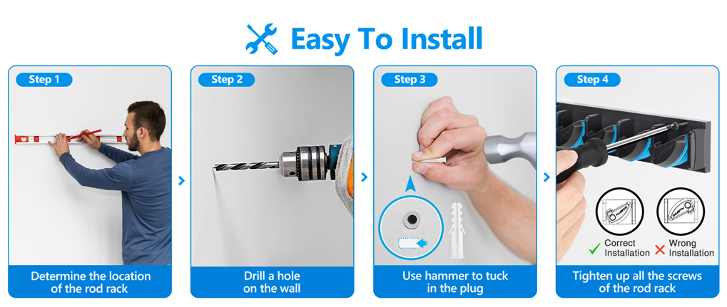 Just 4 steps are required to get a fully installed fishing pole holders for garage. First, level the rod holder and mark the position of mounting holes, then drill holes on the wall and use hammer to tuck in the plug, finally install and tighten all screws.