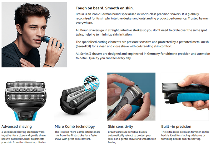 Braun Series 3 shavers. Close shave, perfect skin comfort. With new MicroComb technology the Series 3 electric shaver catches and feeds more hair into the cutting parts, for a faster shave than ever before. Thanks to its triple action cutting system and SensoFoil the Series 3 electric razor not only delivers even better shaving performance on 3-day beards, but is also incredibly smooth on skin. Plus this Wet & Dry 3040 model can even be used in the shower with foam or gel for a more comfortable shaving experience*. The ergonomic grip with iconic Braun rubber dot pattern provides secure handling, even in wet bathroom conditions or when you rinse your shaver under running water. The Smart Plug comes with automatic 100-240 voltage adjustment, so you can use your Braun shaver worldwide when travelling *tested vs. previous Series 3 generation.
